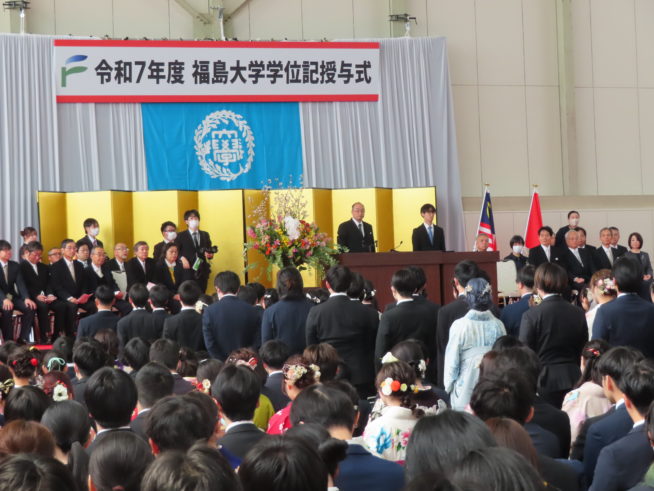 令和8年3月25日、福島大学第1体育館にて令和7年度学位記授与式が行われました(学士946名、修士118名、博士3名)。
